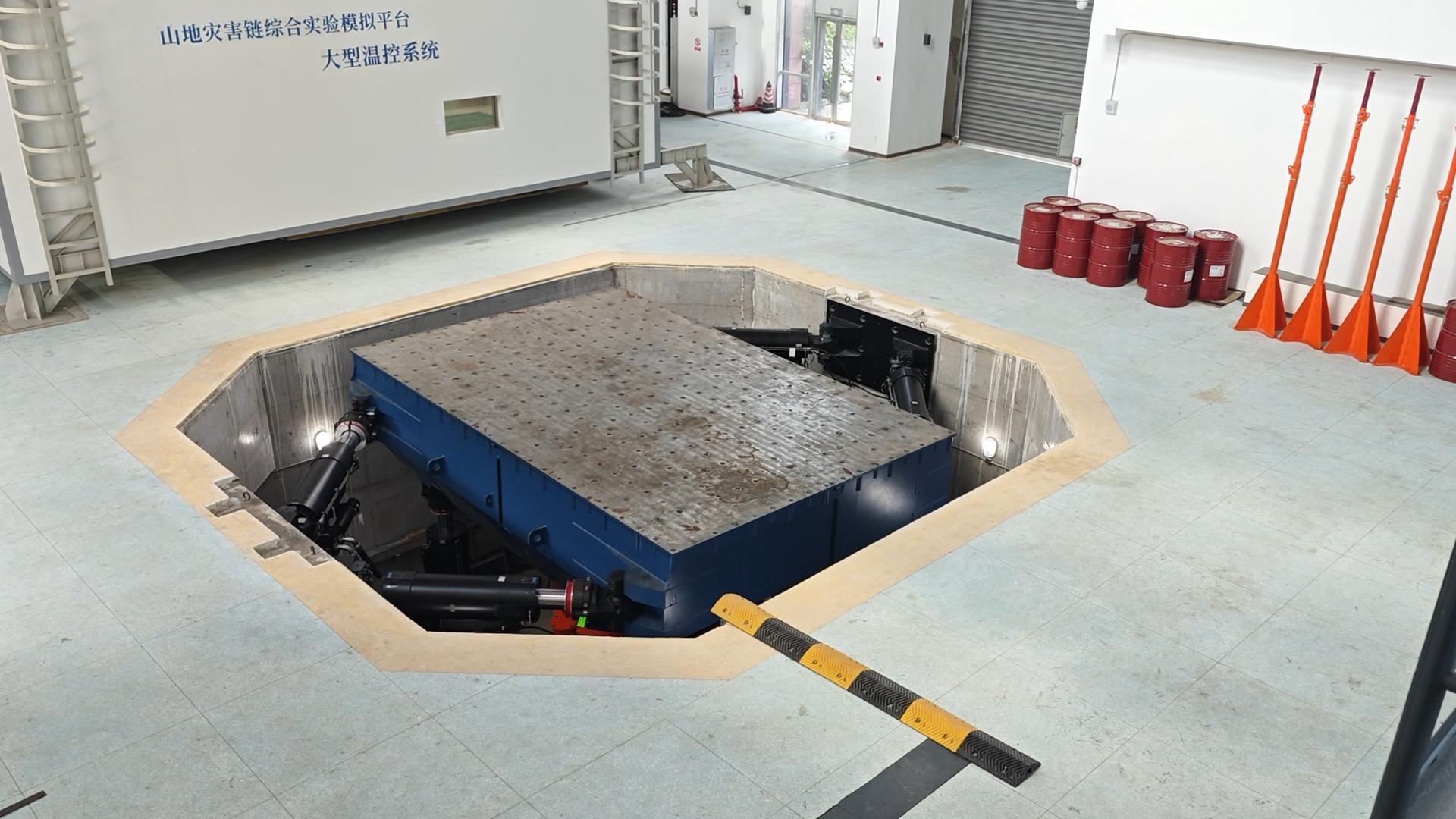 振动实验室是山地灾害链综合实验模拟平台的一部分,实验室内的主装置——山地灾害形成模拟系统是国内首个集地震模拟试验台、降雨装置、温控冻融装置于一体的多场耦合试验平台。