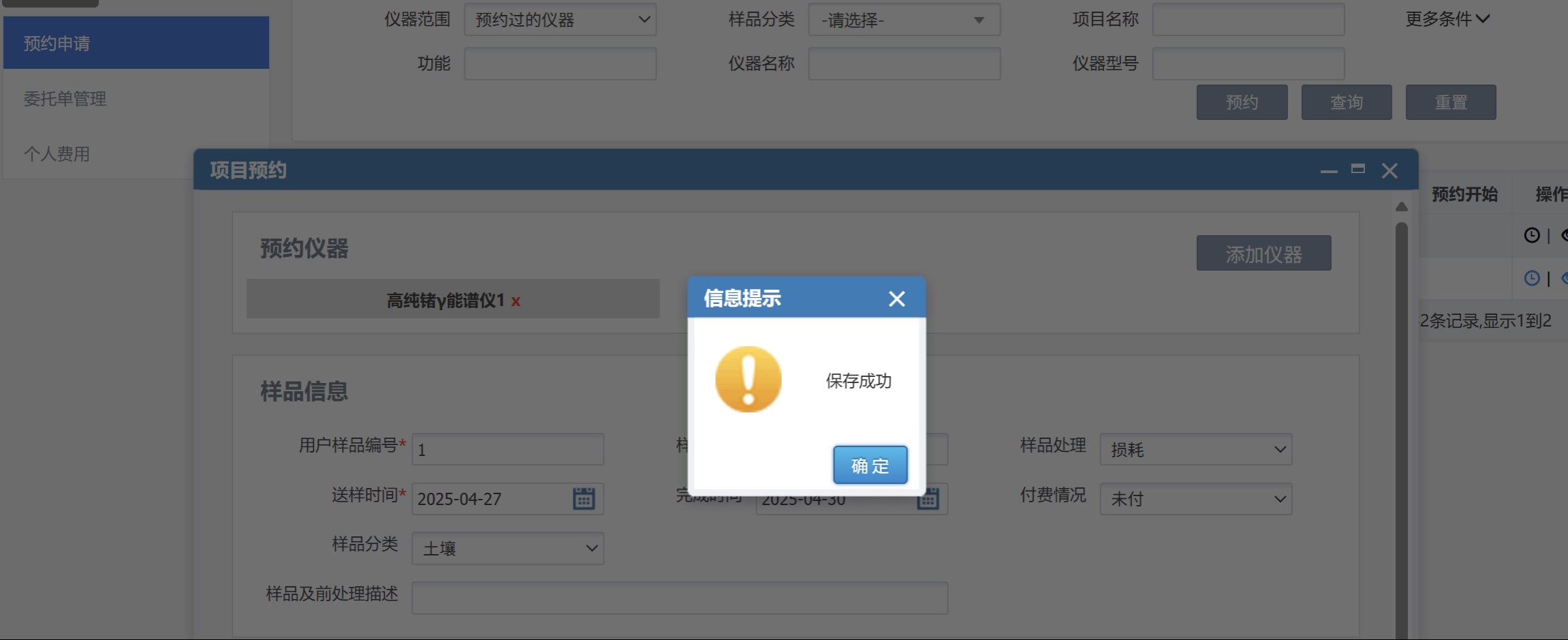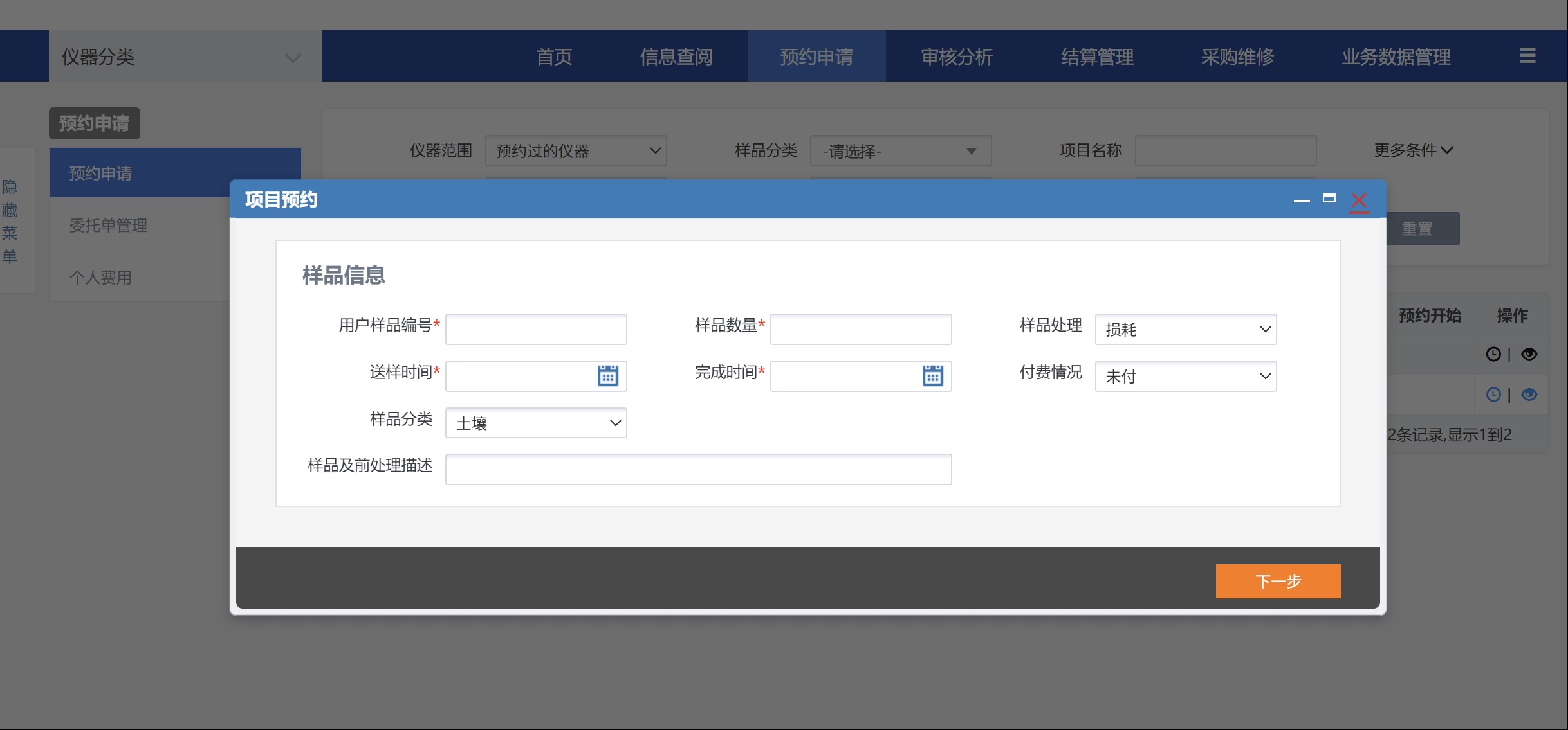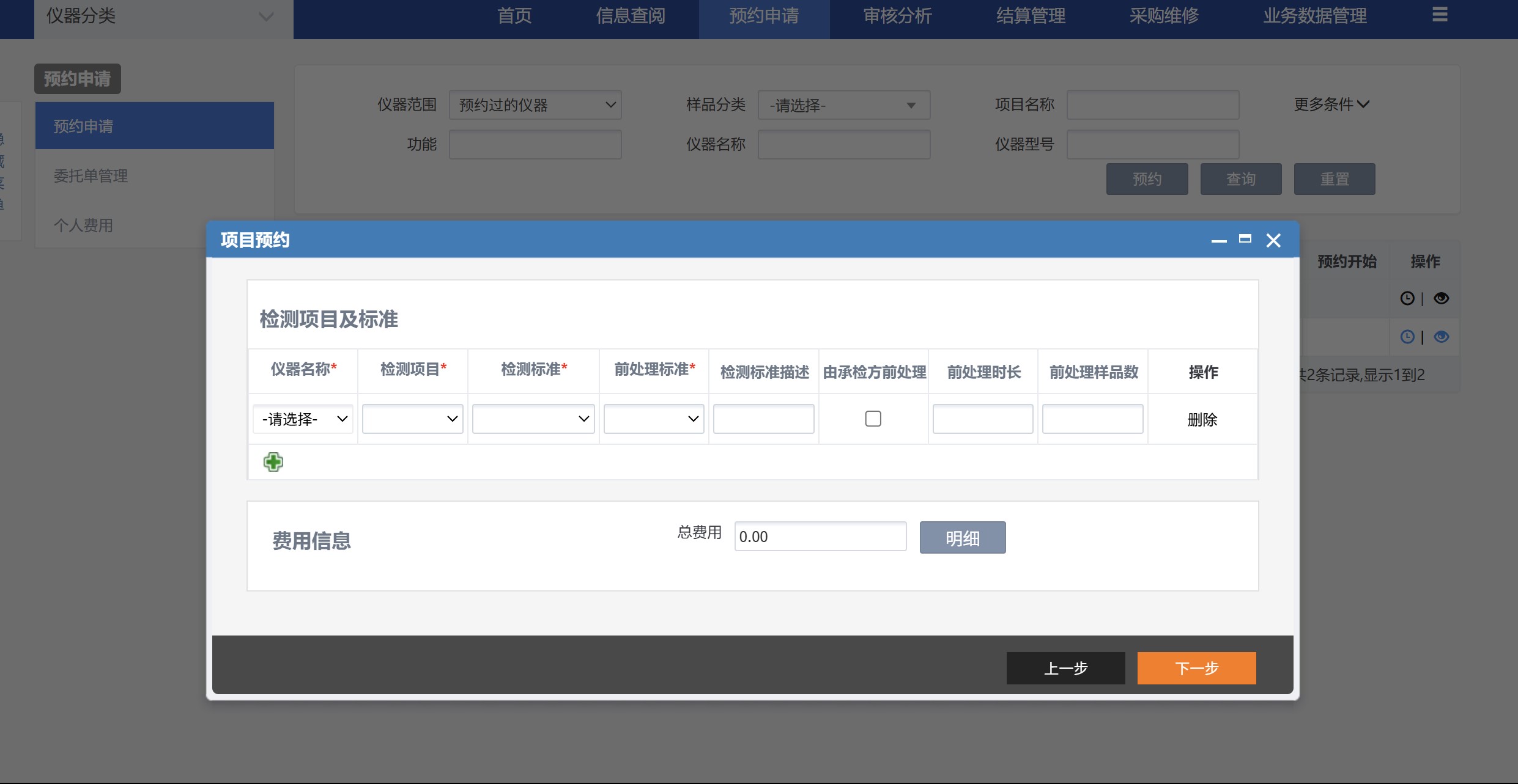 4、依次填写样品信息表、检测项目及标准表,最后保存预约表
