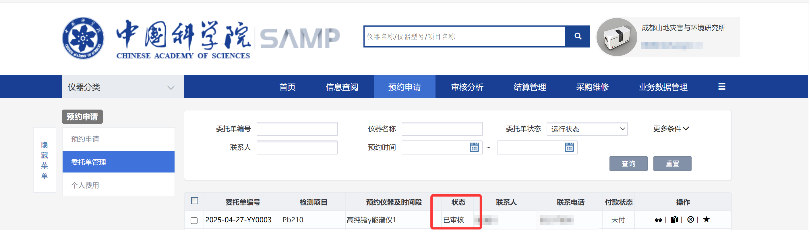 5、待预约单状态为已审核,点击开始,开始使用预约设备(仪器操作人员),若为委托样品可在“审核分析-检测进度”查看样品仪器是否在检测中。